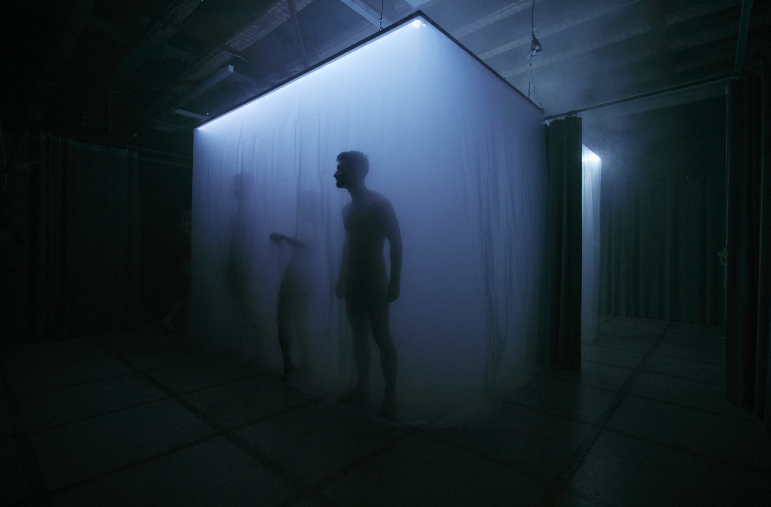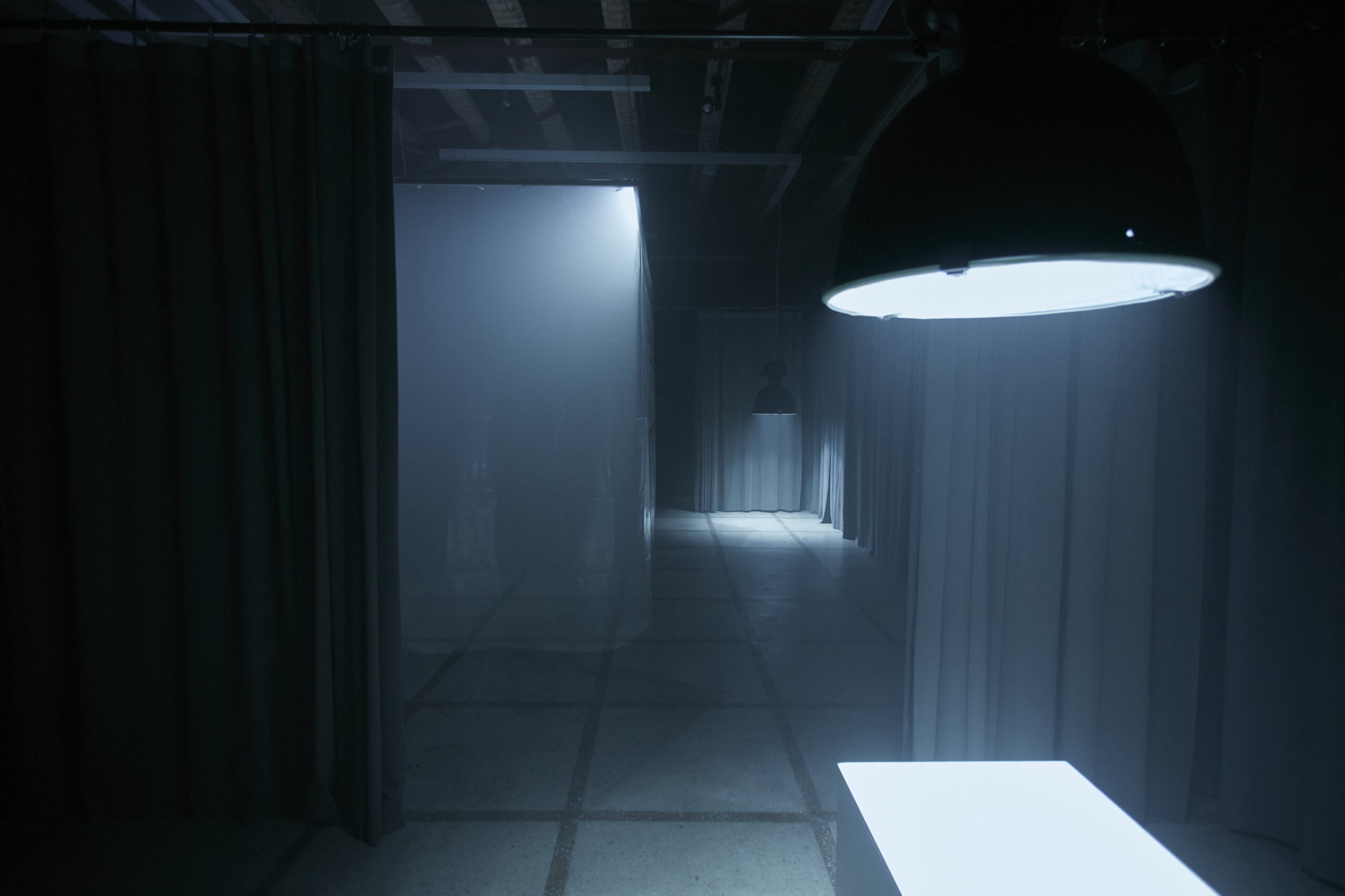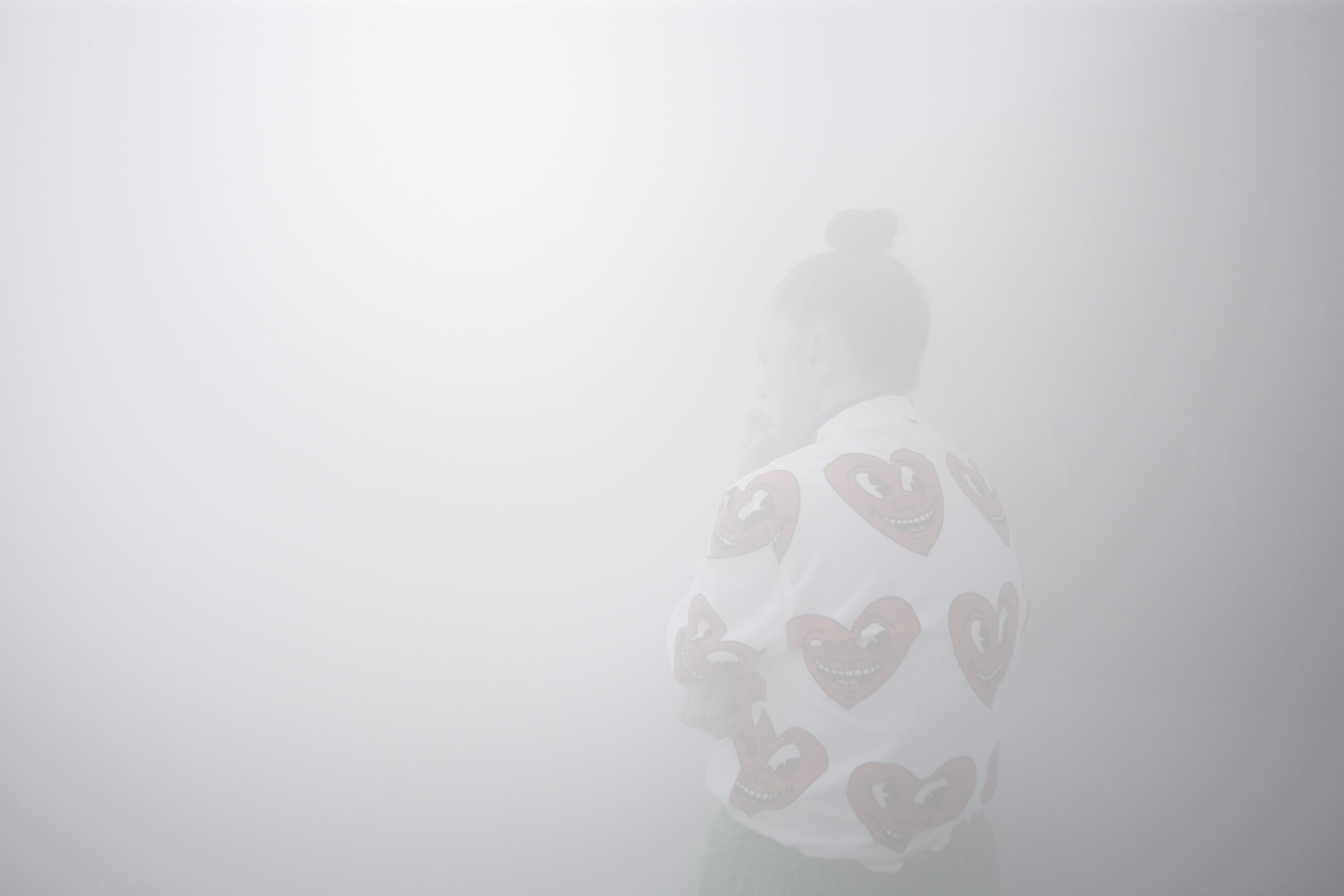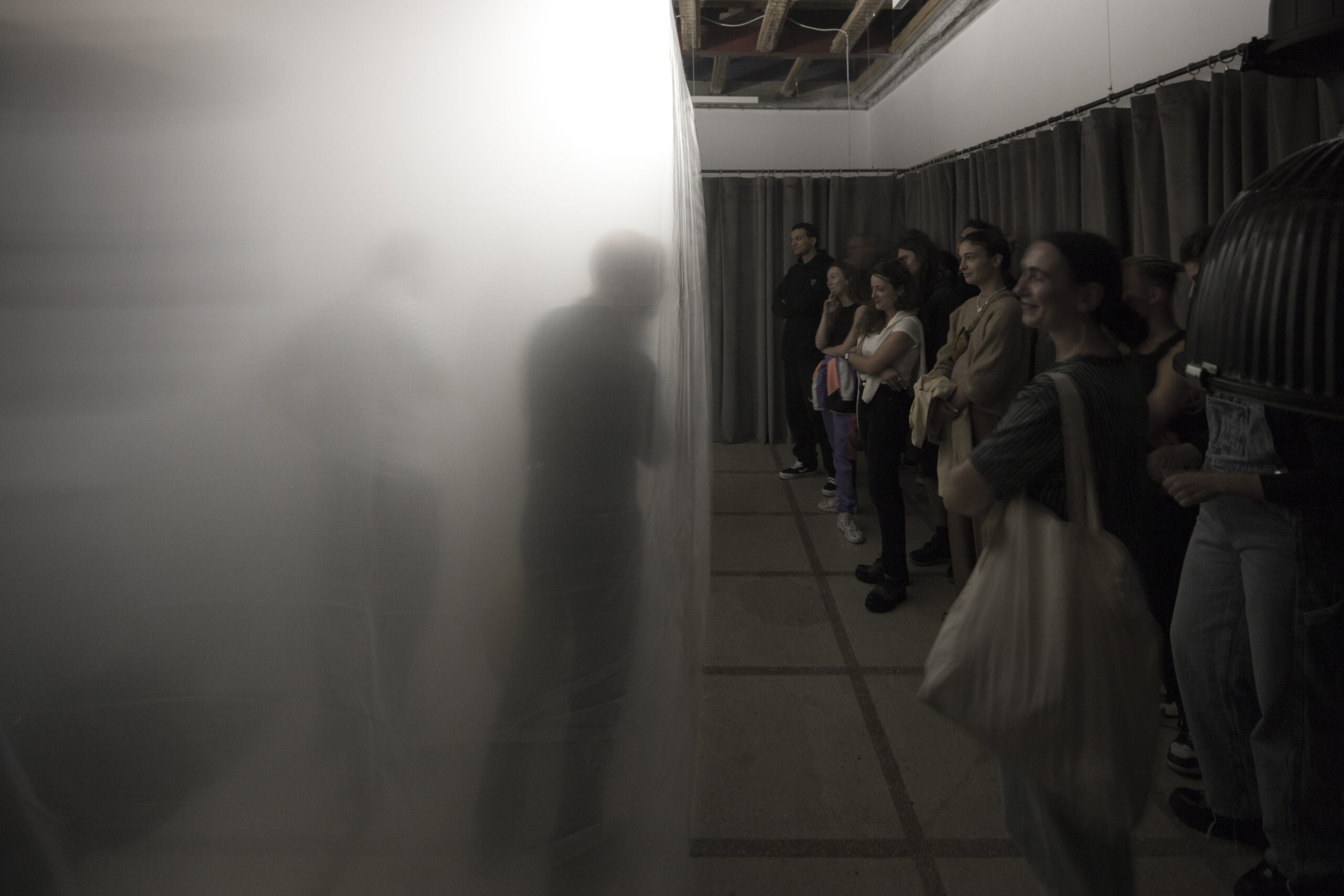 “We begin entering this space, a space that cannot be measured; it is probably generous because it doesn’t feel crowded, surrounded by white smoke, semi-opaque. We exist merely in this smoke for a while, then the lights dim down, and everything feels heavier and heavier.”